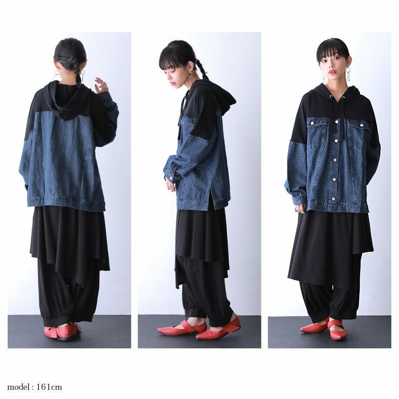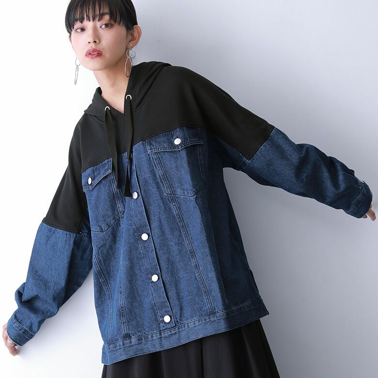 デニムジャケットとパーカーをドッキングしたような新感覚トップスがお洒落ゴコロを満たしてくれる。