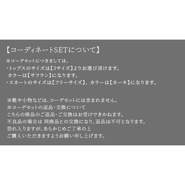 ※コーデセットの返品・交換について。不良品の場合は同商品との交換となり、返品は不可となります。恐れ入りますが、予めご了承の上、ご購入いただけますよう宜しくお願い申し上げます。