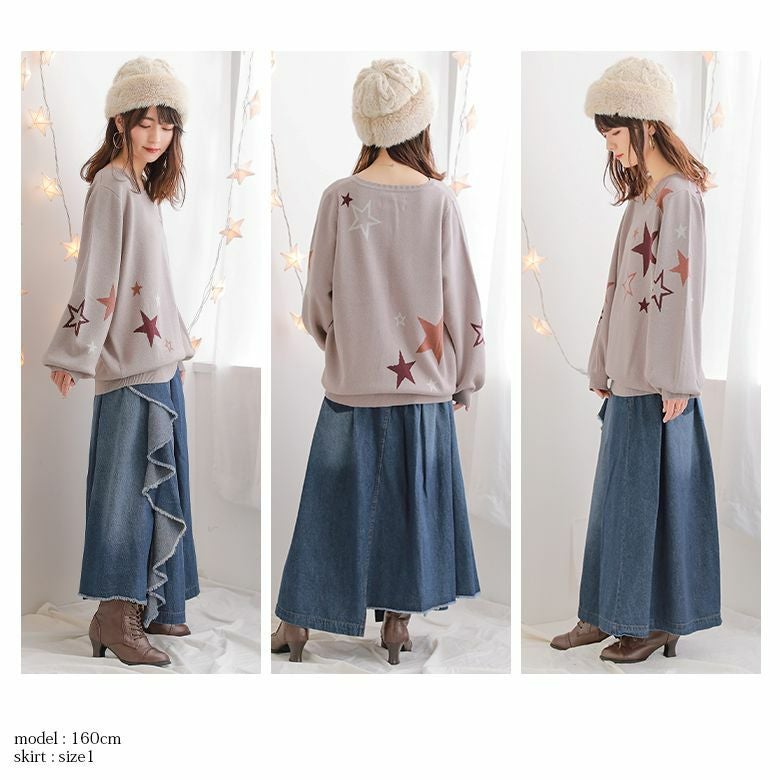 印象を華やかに仕立ててくれる星柄ニット×デニムスカート。