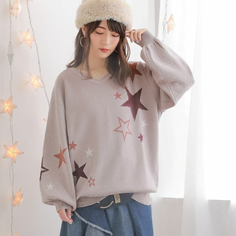 1.配色星柄Vネックニット