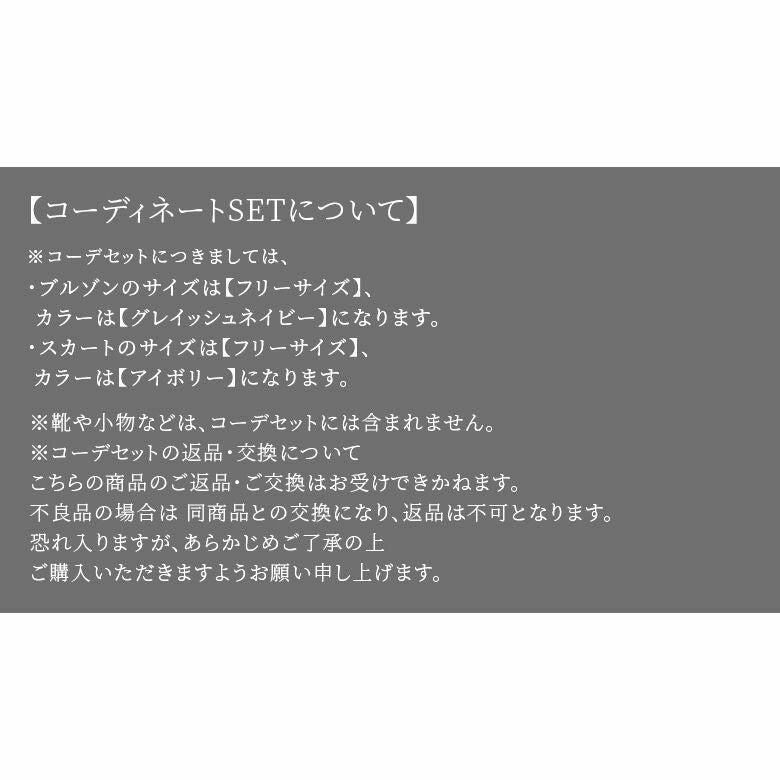 ※コーデセットの返品・交換について。不良品の場合は同商品との交換となり、返品は不可となります。恐れ入りますが、予めご了承の上、ご購入いただけますよう宜しくお願い申し上げます。