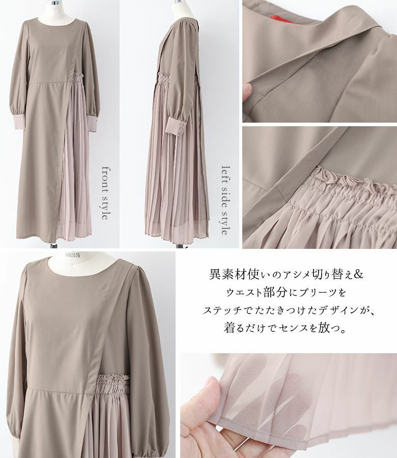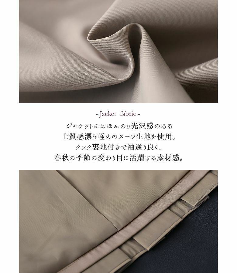 ほんのり光沢があり上質感漂う軽やかなスーツ生地を使用。ワンピースは袖のカフスとプリーツ部分にシフォン生地を切り替え、異素材使いがお洒落ニュアンスを醸し出します。