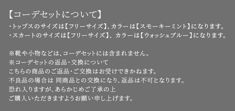 ※コーデセットの返品・交換について。不良品の場合は同商品との交換となり、返品は不可となります。恐れ入りますが、予めご了承の上、ご購入いただけますよう宜しくお願い申し上げます。
