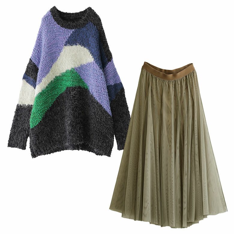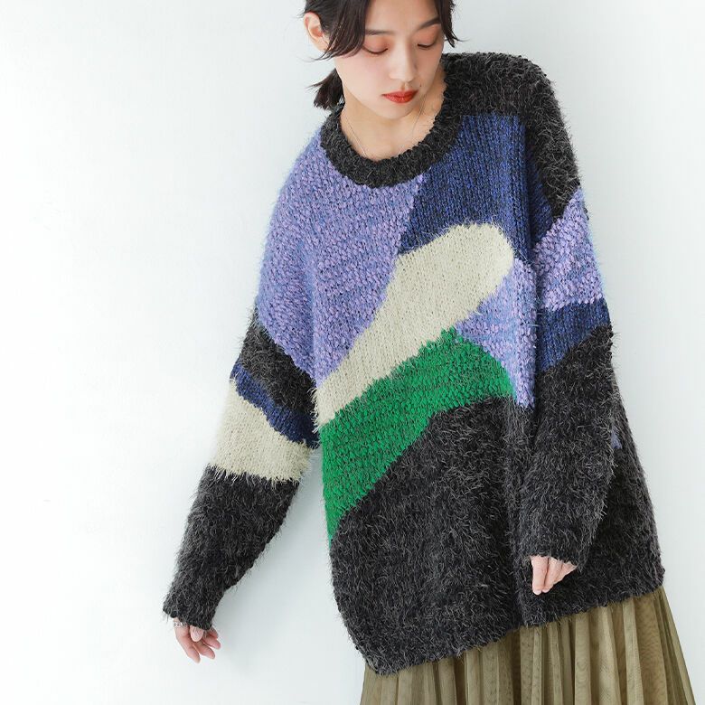 1.配色ブロック切替ミックスヤーンニット