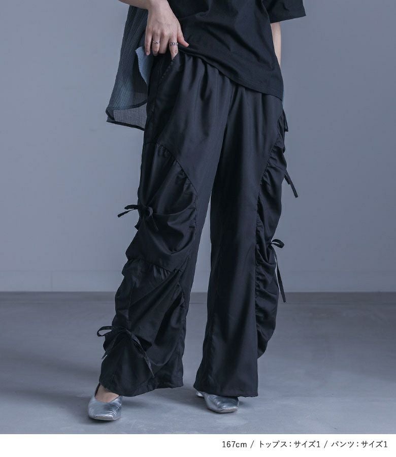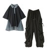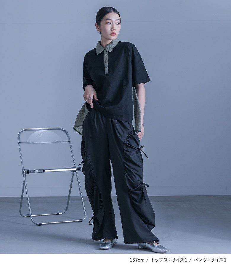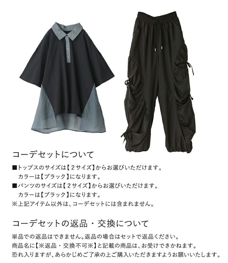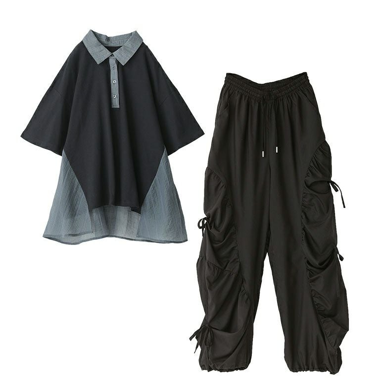 『シアードッキング配色ポロシャツ×ギャザー切替裾ドロストパンツコーデ2点SET』
