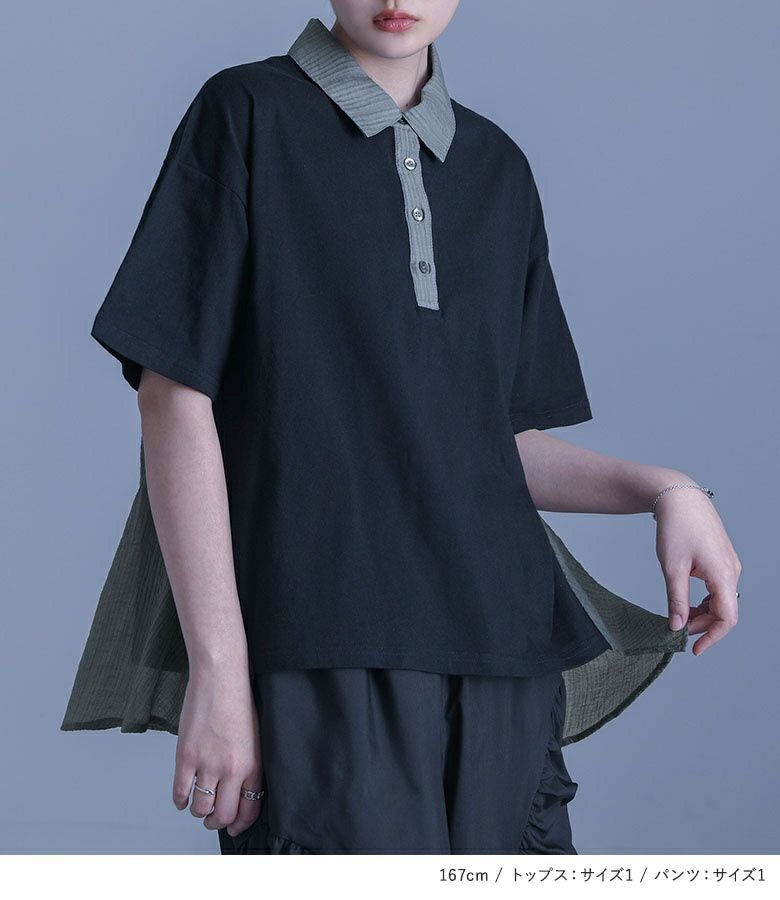 4. 【送料無料】『シアードッキング配色ポロシャツ×ギャザー切替裾ドロストパンツコーデ2点SET』【メール便不可】【30】