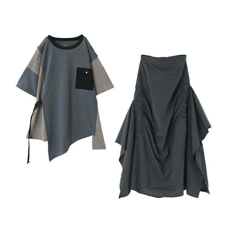 『配色アシメカットソー×アシンメトリーシャーリングスカートコーデ2点SET』