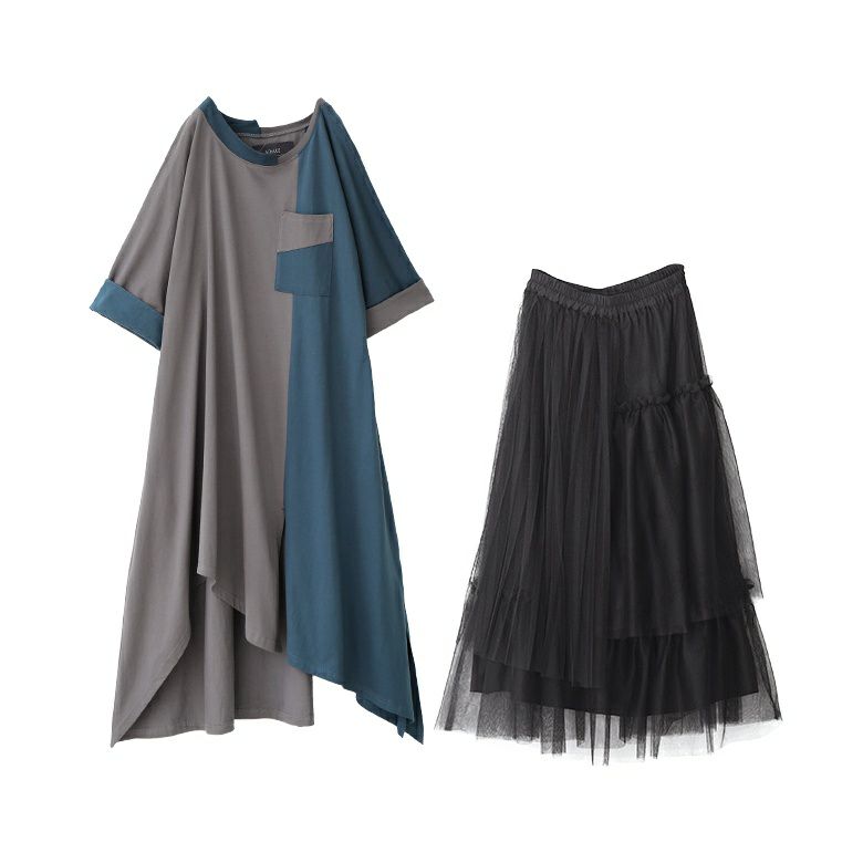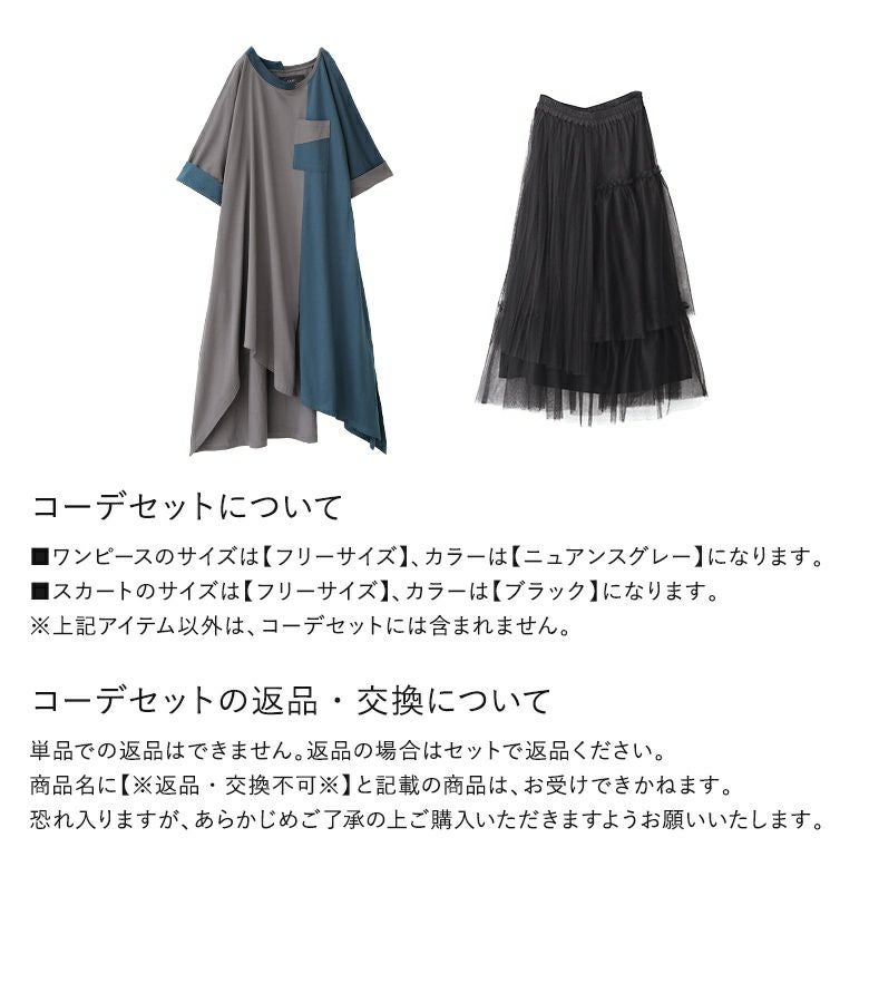 『バイカラーアシメ切替ワンピース×プリーツデザインチュールスカートコーデ2点SET』