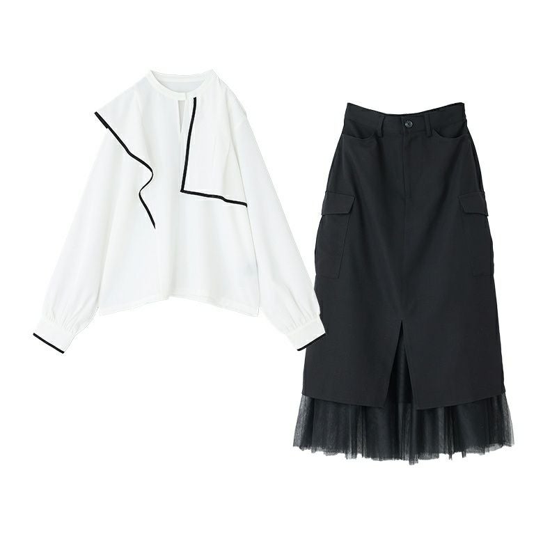 『フリルヨークデザインシャツ×チュール切替ナロースカートコーデ2点SET』