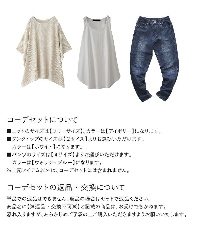 4. 【送料無料】『透かし編みボックスシルエットニット×着回しシャツ型タンクトップ×ストレッチボーイフレンドデニムコーデ3点SET』【メール便不可】【25】