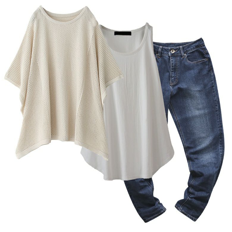 『透かし編みボックスシルエットニット×着回しシャツ型タンクトップ×ストレッチボーイフレンドデニムコーデ3点SET』