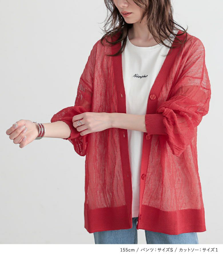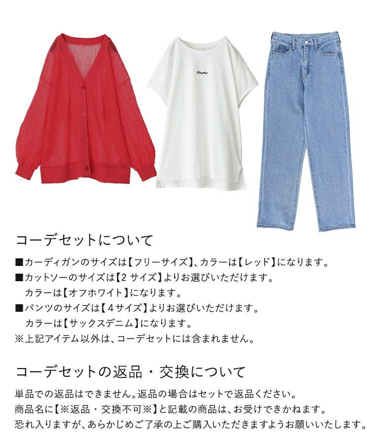 4. 【送料無料】『シアーカーディガン×冷感キープフレンチスリーブ刺繍カットソー×ストレートデニムパンツコーデ3点SET』【メール便不可】【35】