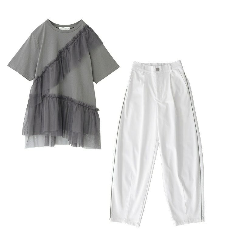『サイドライン入り接触冷感カーブパンツ×冷感キープチュールフリルドッキングカットソーコーデ2点SET』
