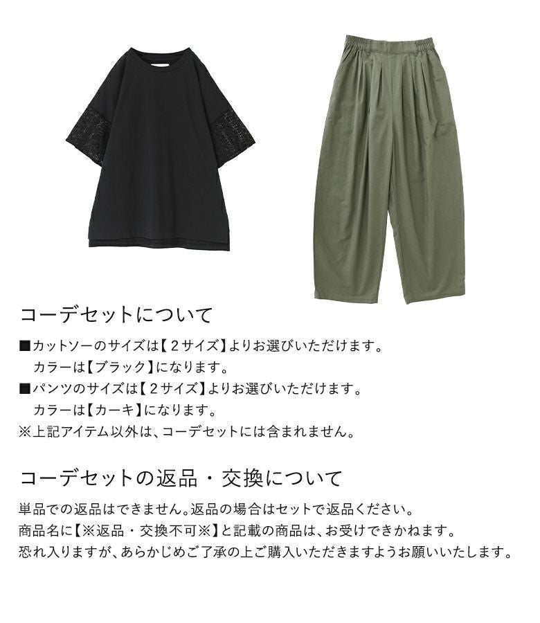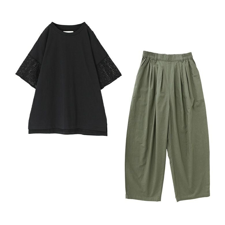 『レーススリーブカットソー×綿麻混冷感バレルレッグパンツコーデ2点SET』