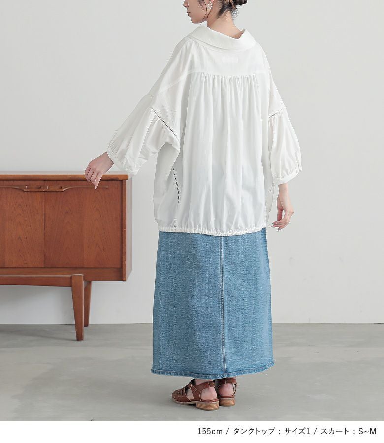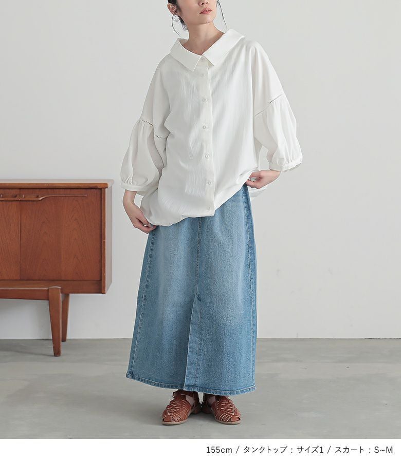 4. 【送料無料】『ふんわりパフスリーブブラウス×襟元レースデザインタンク×ストレッチデニムナロースカートコーデ3点SET』【メール便不可】【35】