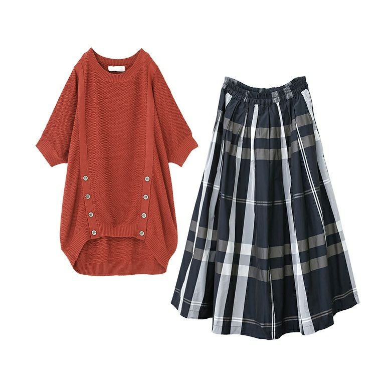 『フロント釦ラグランニット×チェック柄タックフレアスカートコーデ2点SET』