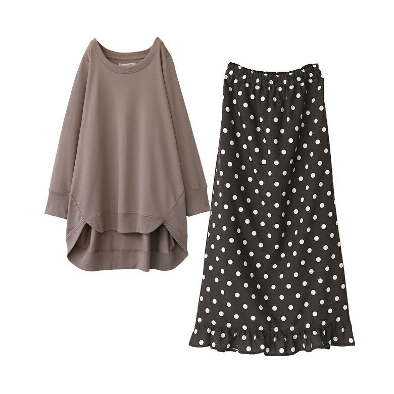 『ミニ裏毛デザインプルオーバー×ミニフリルドットナロースカートコーデ2点SET』