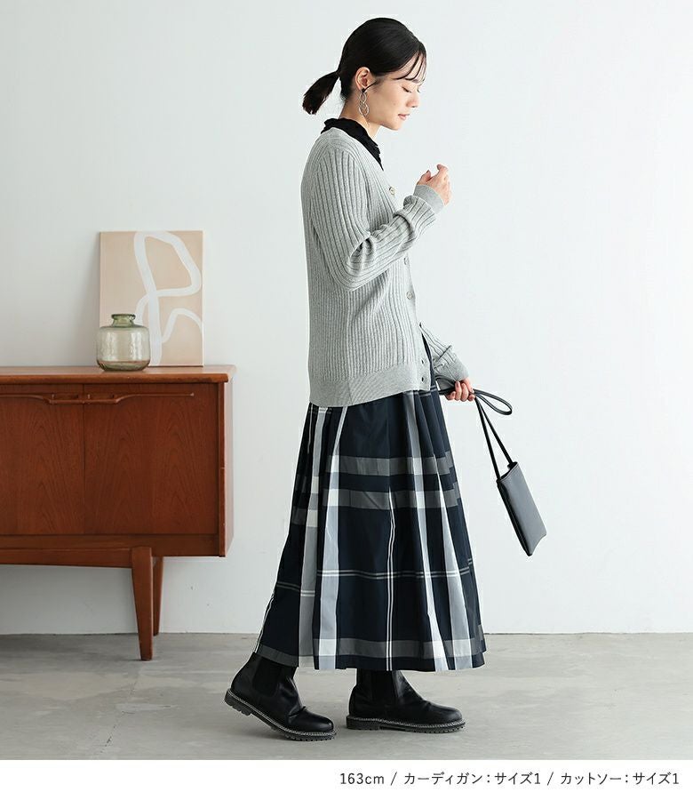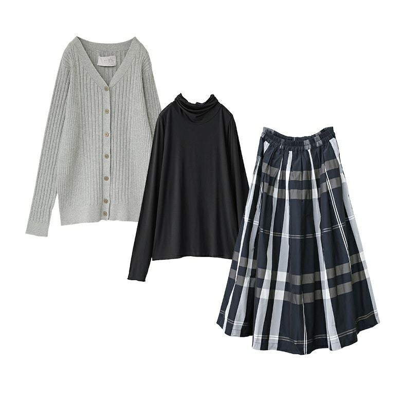 『リブニットカーディガン×タートルネックモチモチロンT×チェック柄タックフレアスカートコーデ3点SET』