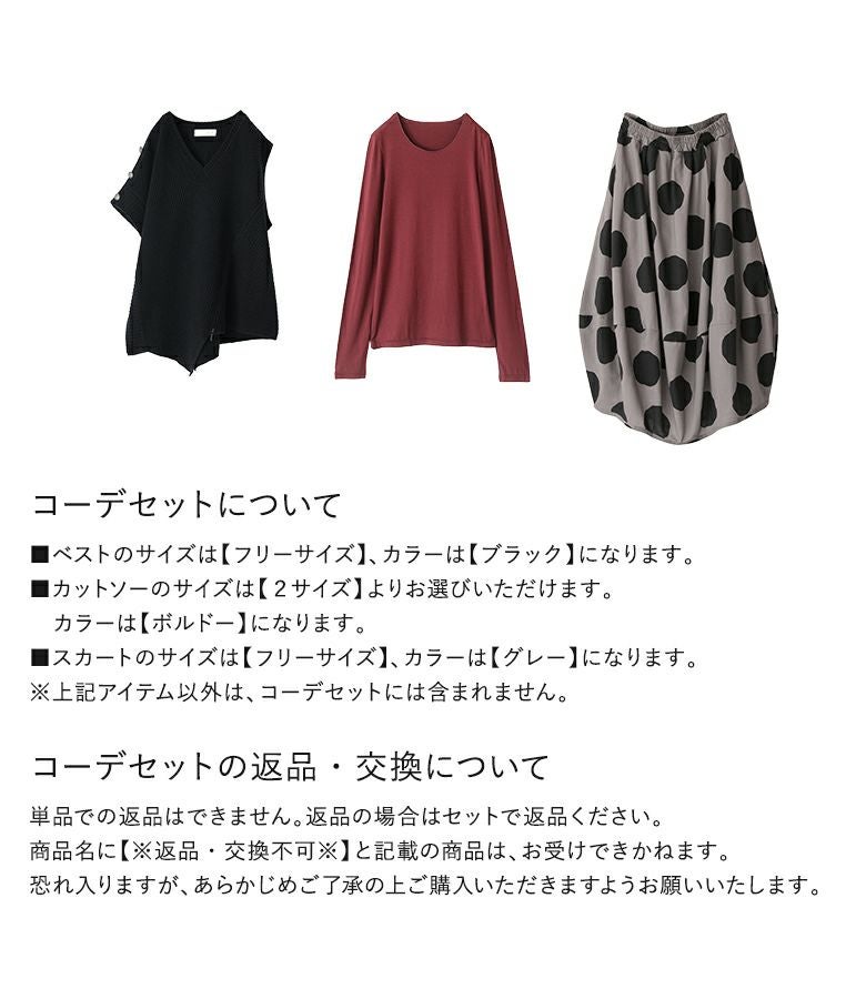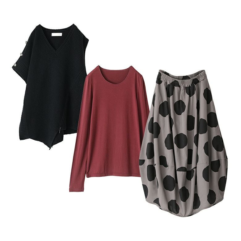 『アシメデザインニットベスト×ラウンドネックモチモチロンT×ドットコクーンスカートコーデ3点SET』