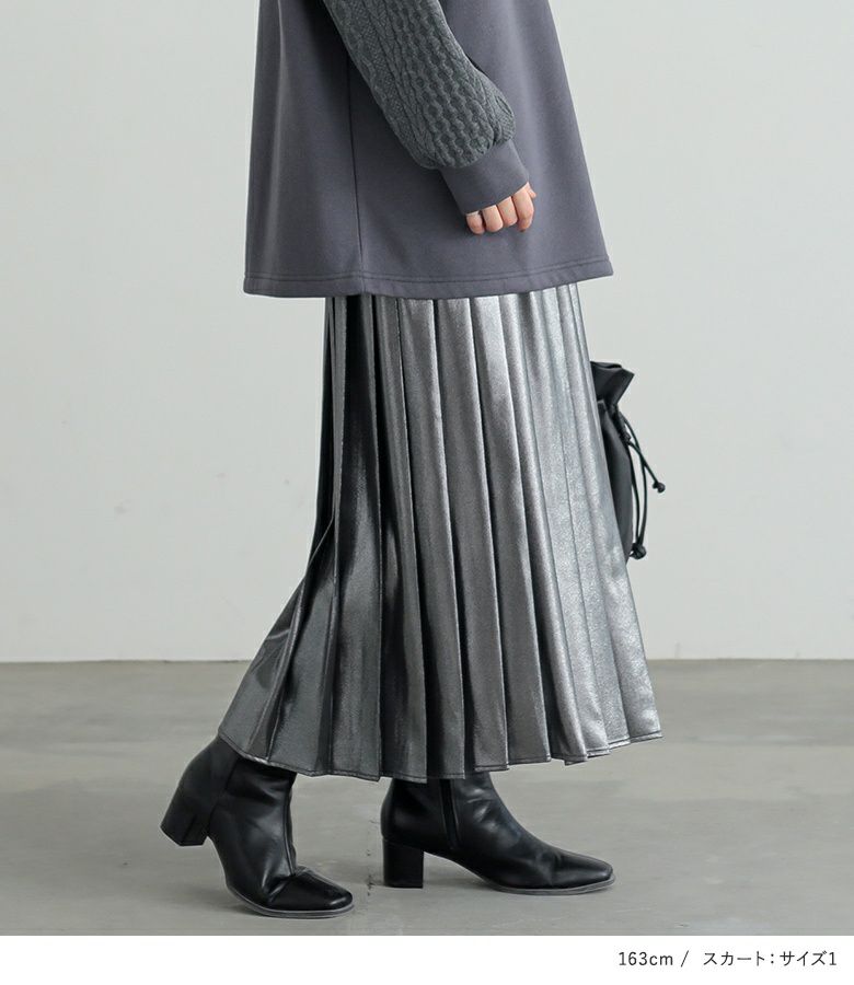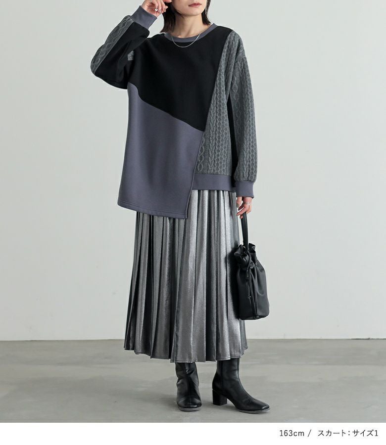 4. 【送料無料】『裏起毛アシメ異素材プルオーバー×メタリックプリーツスカートコーデ2点SET』【メール便不可】【50】