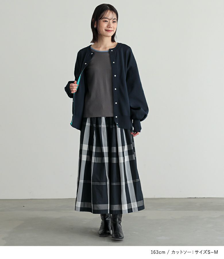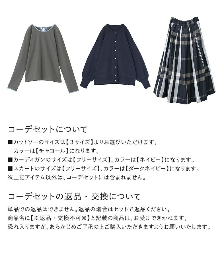『後ろリボン裏起毛リブカットソー×ボリュームスリーブカーディガン×チェック柄フレアスカートコーデ3点SET』