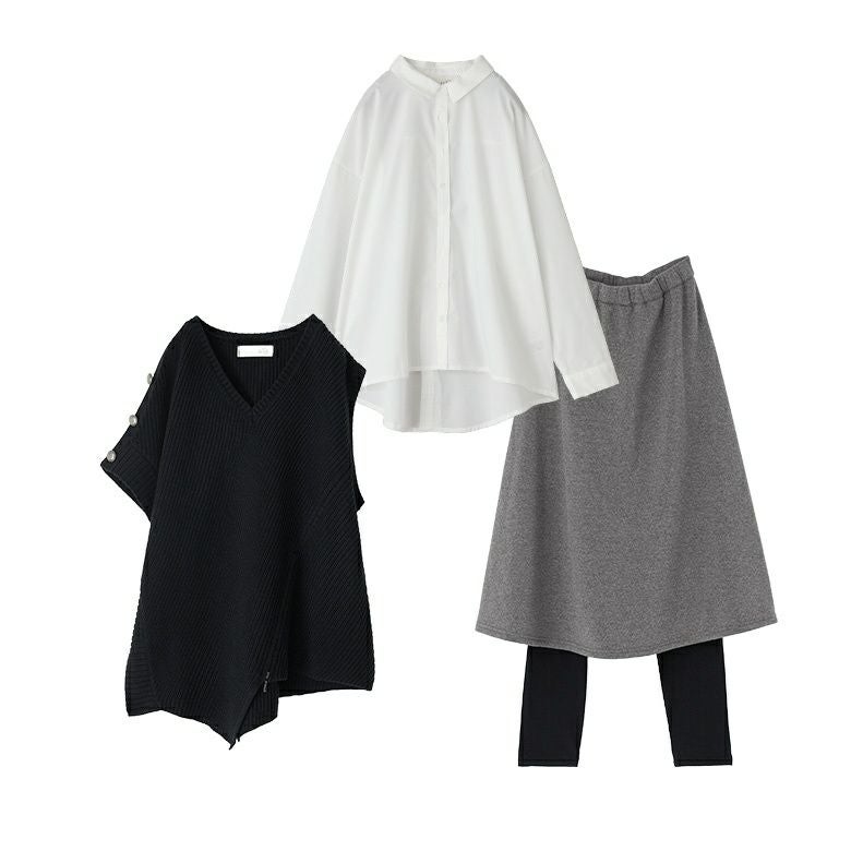 『リブレギンスドッキング裏起毛スカート×アシメデザインニットベスト×バックボタンスリットシャツコーデ3点SET』