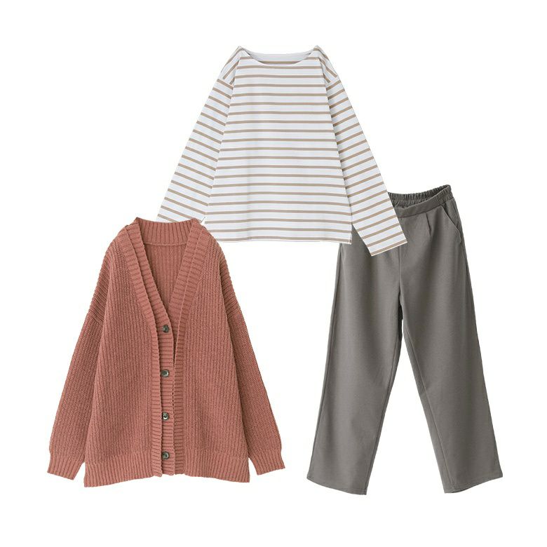 『ウールライクすっきりテーパードパンツ×ボーダーバスクロンT×ダブルリブ畦編みカーディガンコーデ3点SET』
