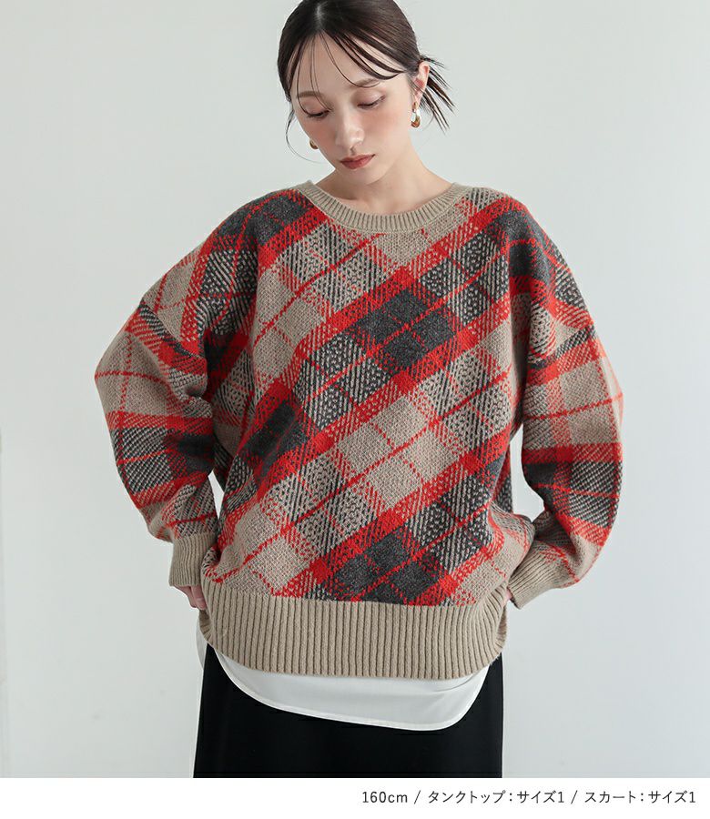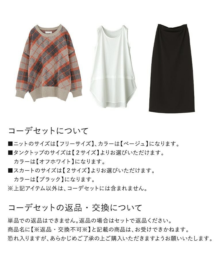 4. 【送料無料】『チェックジャカードニット×吸水速乾レイヤードタンクトップ×ナローシルエットロングスカートコーデ3点SET』【メール便不可】【50】