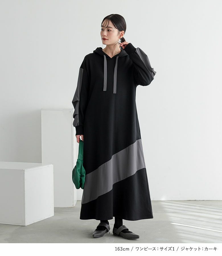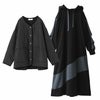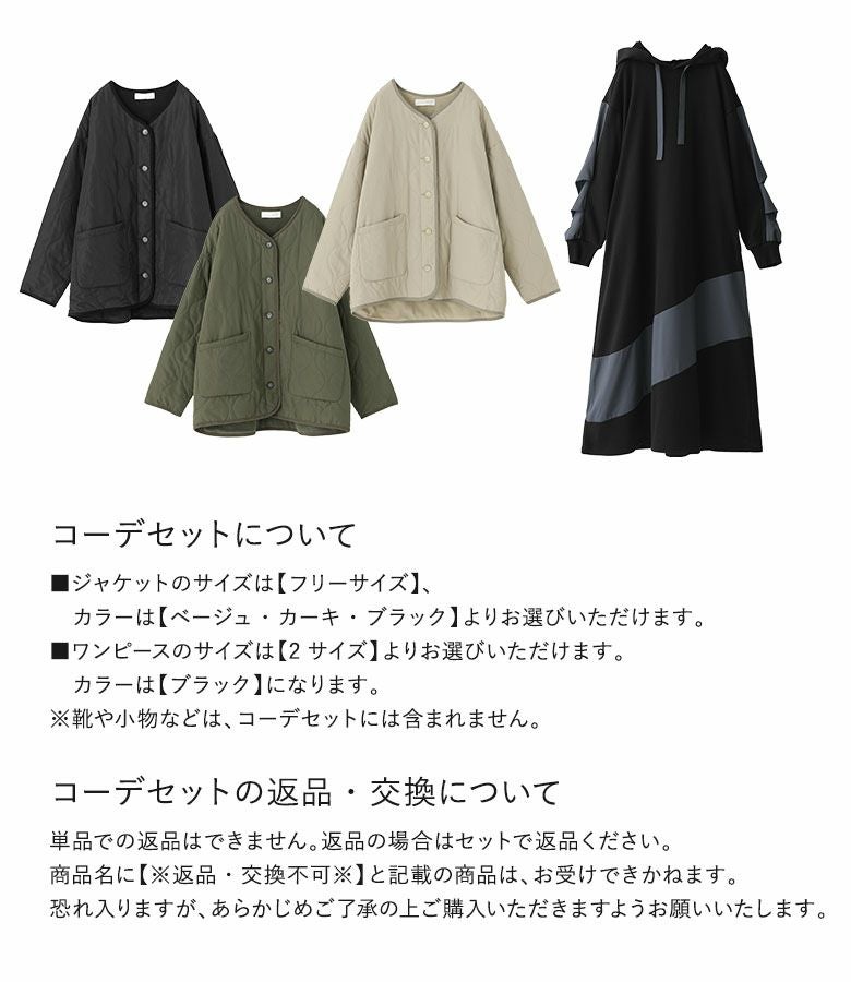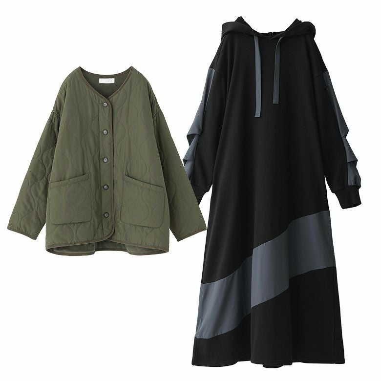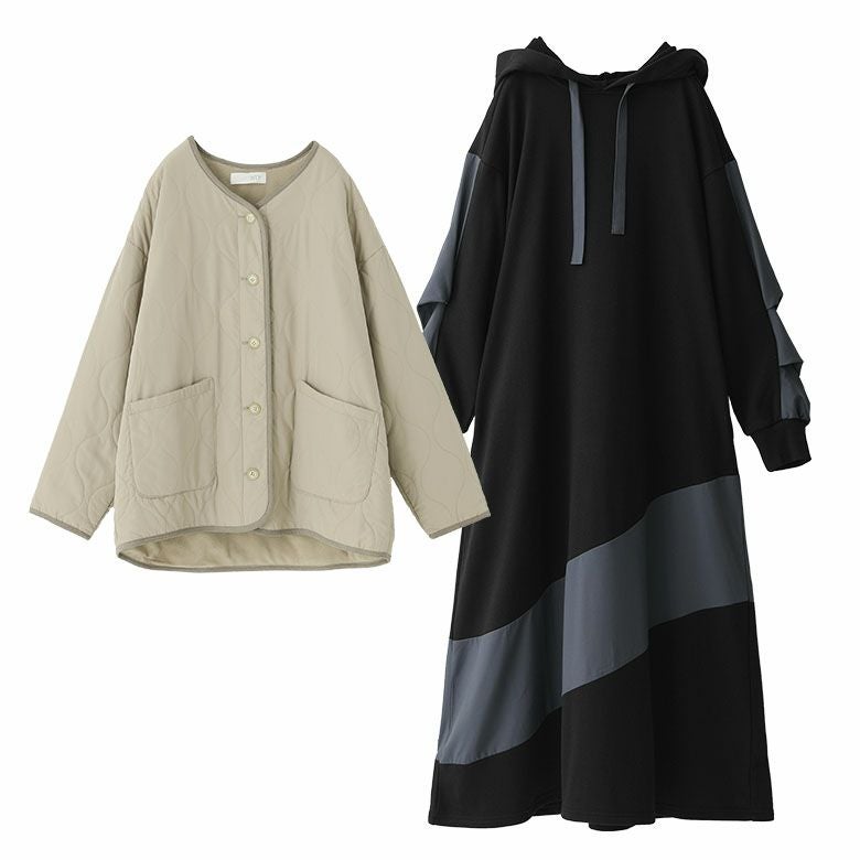 『ノーカラーキルティングジャケット×異素材切替フード付きワンピースコーデ2点SET』