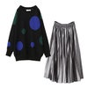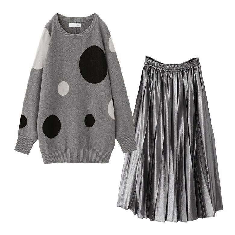 『ドットドルマンニット×メタリックプリーツスカートコーデ2点SET』[2点コーデセット 2025 レディース ニット トップス セーター クルーネック スカート ロングスカート プリーツスカート