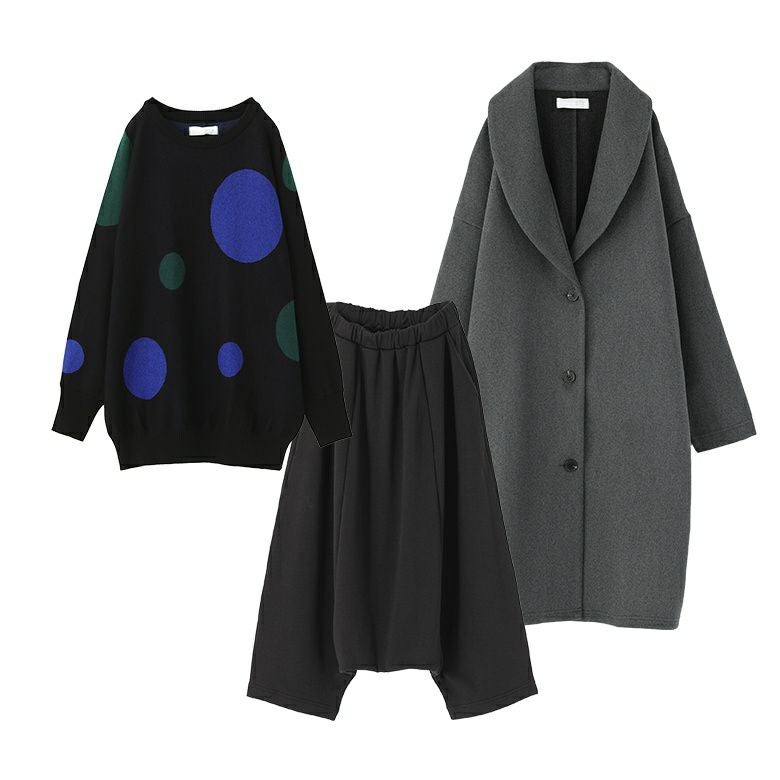 『ドットドルマンニット×裏シャギーサルエルパンツ×ウールライクショールカラーコートコーデ3点SET』