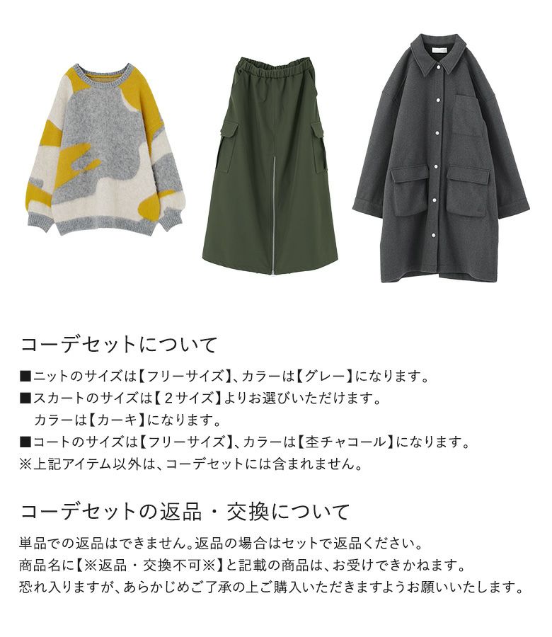 『裏起毛センタージップカーゴスカート×ウールライクステンカラーコート×起毛配色ジャカードニットコーデ3点SET』