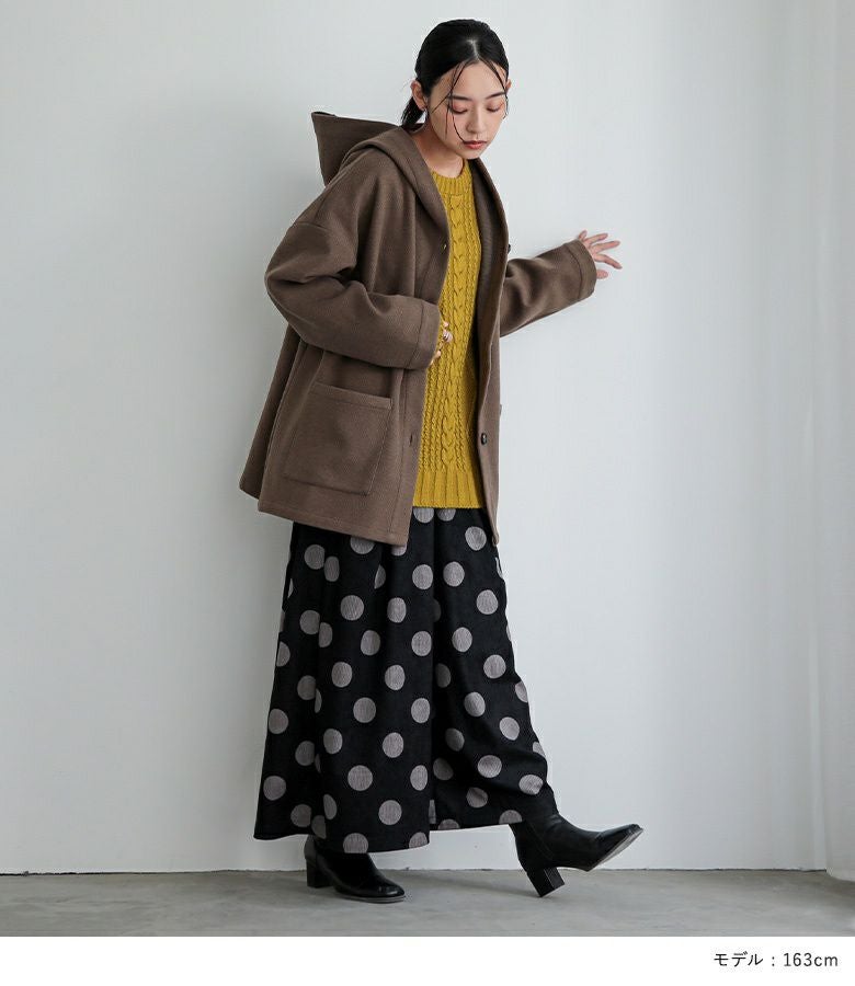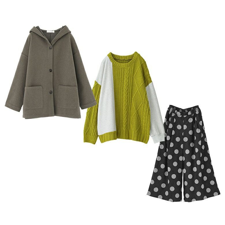 『フード付きウールライクコーディガン×ドットコーデュロイワイドパンツ×配色異素材切替ニットコーデ3点SET』