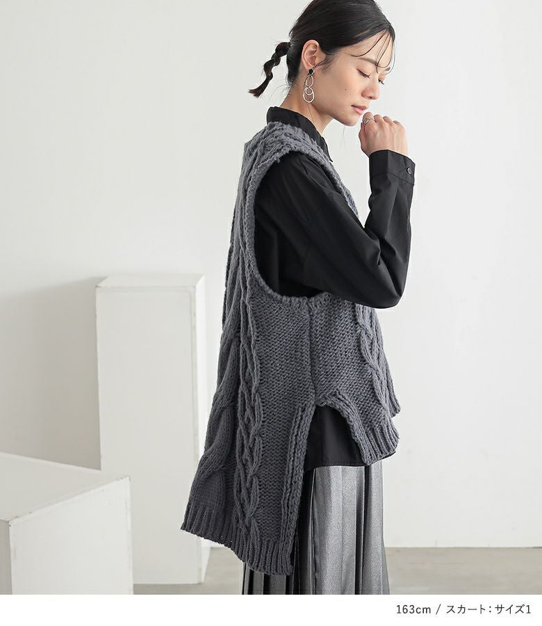 4. 【送料無料】『ローゲージケーブルニットベスト×バックボタンスリットシャツ×メタリックプリーツスカートコーデ3点SET』【メール便不可】【55】