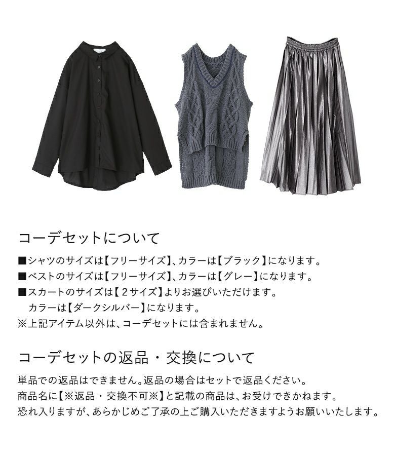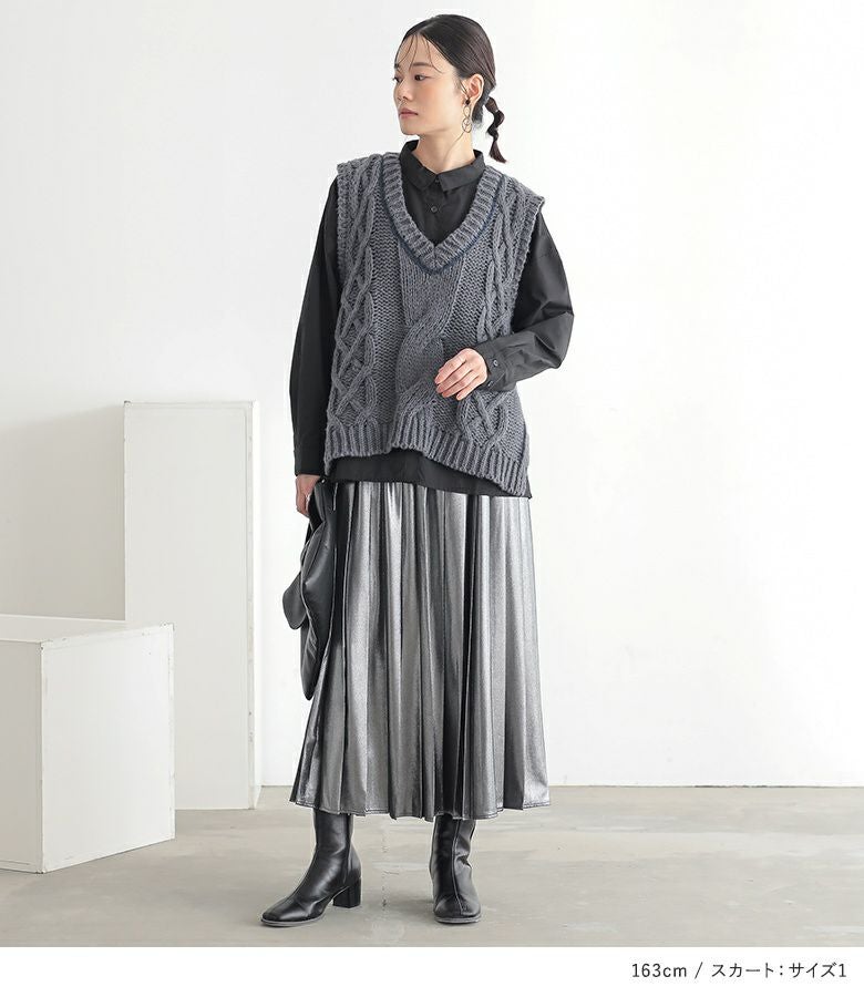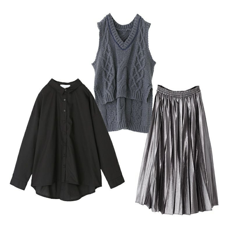 『ローゲージケーブルニットベスト×バックボタンスリットシャツ×メタリックプリーツスカートコーデ3点SET』