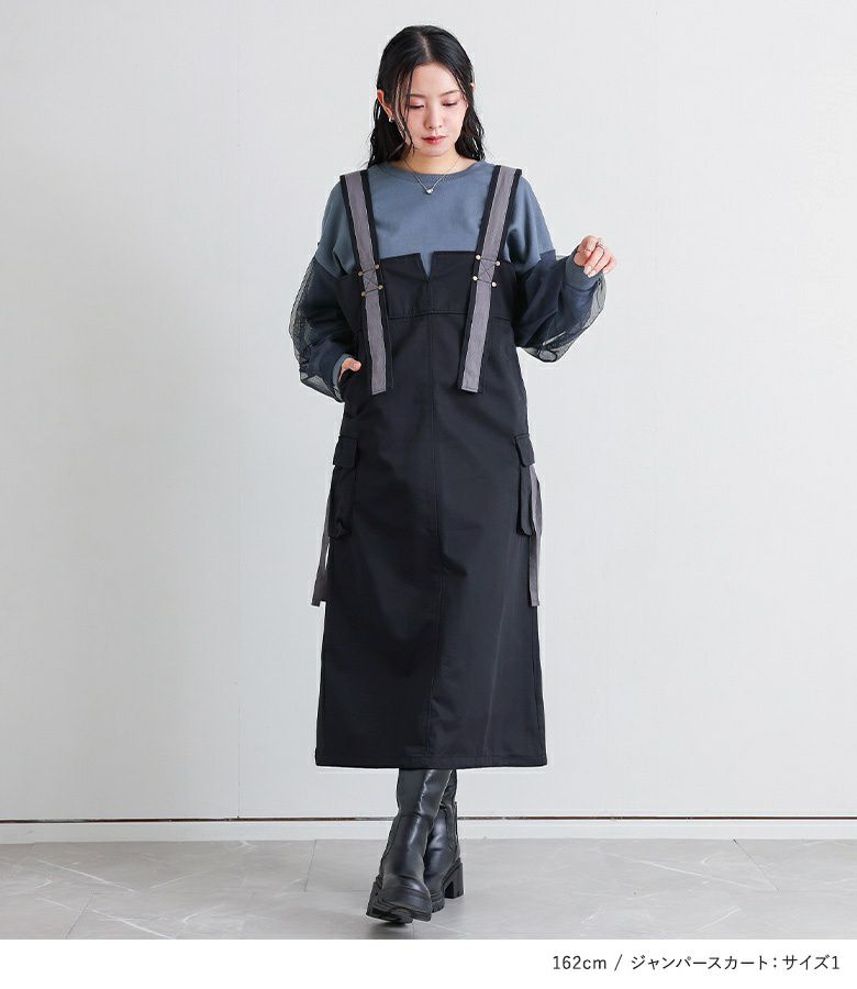『チュールランタンスリーブスウェット×ワークデザインジャンパースカートコーデ2点SET』