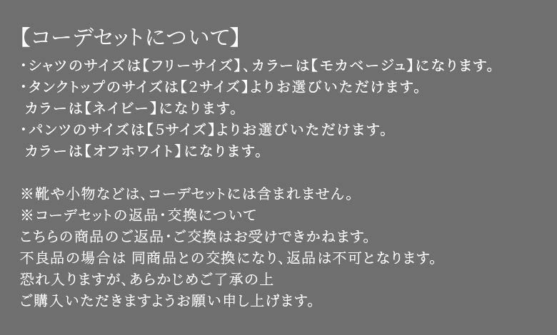 ※コーデセットの返品・交換について。不良品の場合は同商品との交換となり、返品は不可となります。恐れ入りますが、予めご了承の上、ご購入いただけますよう宜しくお願い申し上げます。