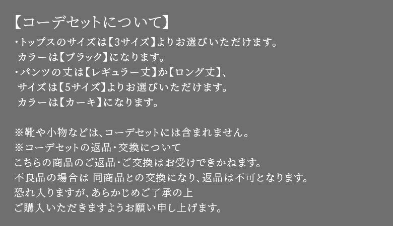 ※コーデセットの返品・交換について。不良品の場合は同商品との交換となり、返品は不可となります。恐れ入りますが、予めご了承の上、ご購入いただけますよう宜しくお願い申し上げます。