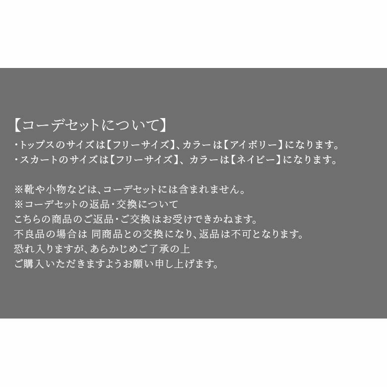 ※コーデセットの返品・交換について。不良品の場合は同商品との交換となり、返品は不可となります。恐れ入りますが、予めご了承の上、ご購入いただけますよう宜しくお願い申し上げます。