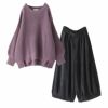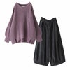 セットアップなので考えずに素敵にきれます。ラベンダーセーターとブラックのパンツの色合いが好きです。この形のパンツは初めてですが、動きやすいし可愛いですね。