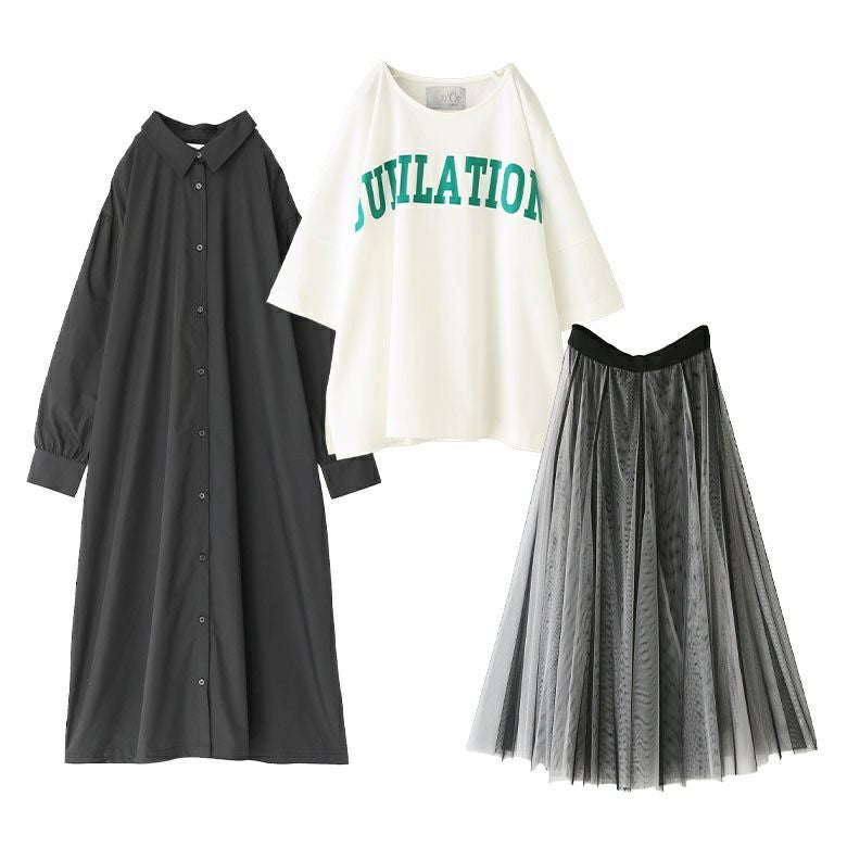 他の画像を見る 送料無料★届いてすぐにお洒落に変身3点コーデSET♪ 【送料無料】『シャツワンピース×汗ジミ防止ゆるっとロゴTシャツ×配色ボリュームチュールスカートコーデ3点SET』【メール便不可】【30】 ¥ 11,930 税込 (0)