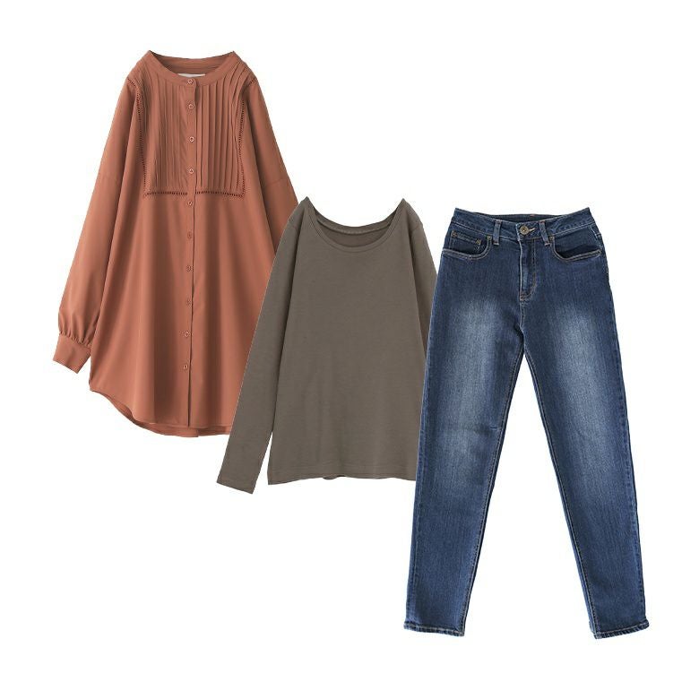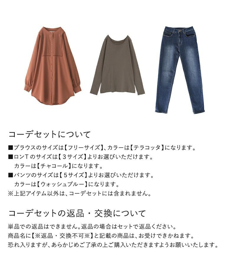 他の画像を見る 送料無料★届いてすぐにお洒落に変身3点コーデSET♪ 【送料無料】『ピンタックはしごレースブラウス×吸湿発熱ラウンドネックロンT×ストレッチボーイフレンドデニムコーデ3点SET』【メール便不可】【30】 ¥ 13,550 税込 (0)