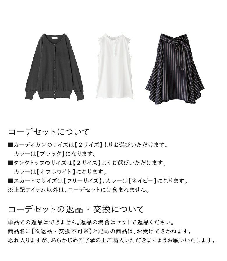 他の画像を見る 送料無料★届いてすぐにお洒落に変身3点コーデSET♪ 【送料無料】『クラシカルストライプスカート×シンプルUネックニットカーディガン×フリル襟インナータンクトップコーデ3点SET』【メール便不可】【35】 ¥ 12,360 税込 (0)