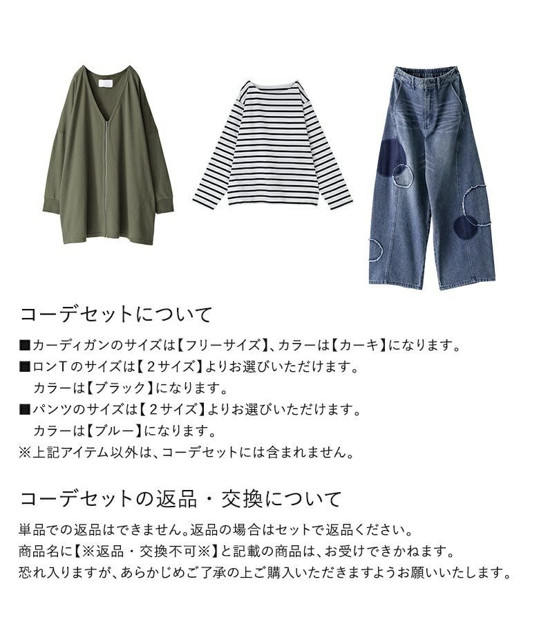 他の画像を見る 送料無料★届いてすぐにお洒落に変身3点コーデSET♪ 【送料無料】『ドットパッチワークデニムパンツ×ボーダーバスクロンT×スウェットジップカーディガンコーデ3点SET』【メール便不可】【60】 ¥ 13,550 税込 (0)