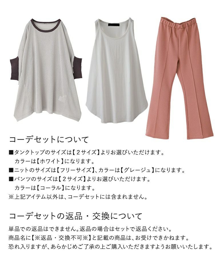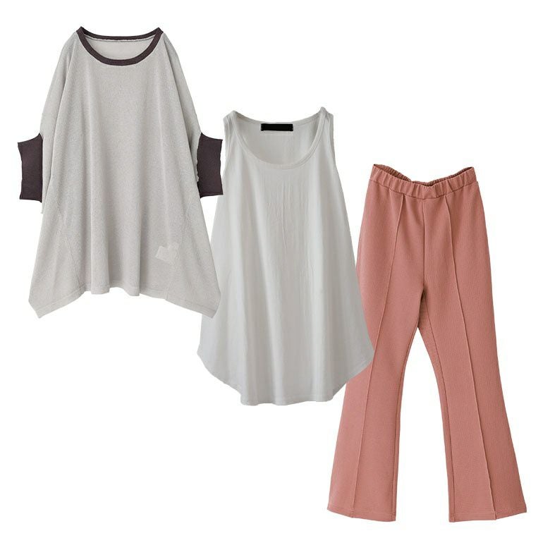 他の画像を見る 送料無料★届いてすぐにお洒落に変身3点コーデSET♪ 【送料無料】『接触冷感カットソーフレアパンツ×シンプルシャツ型タンクトップ×冷感UVカットルマンシアーニットコーデ3点SET』【メール便不可】【25】 ¥ 8,930 税込 (0)