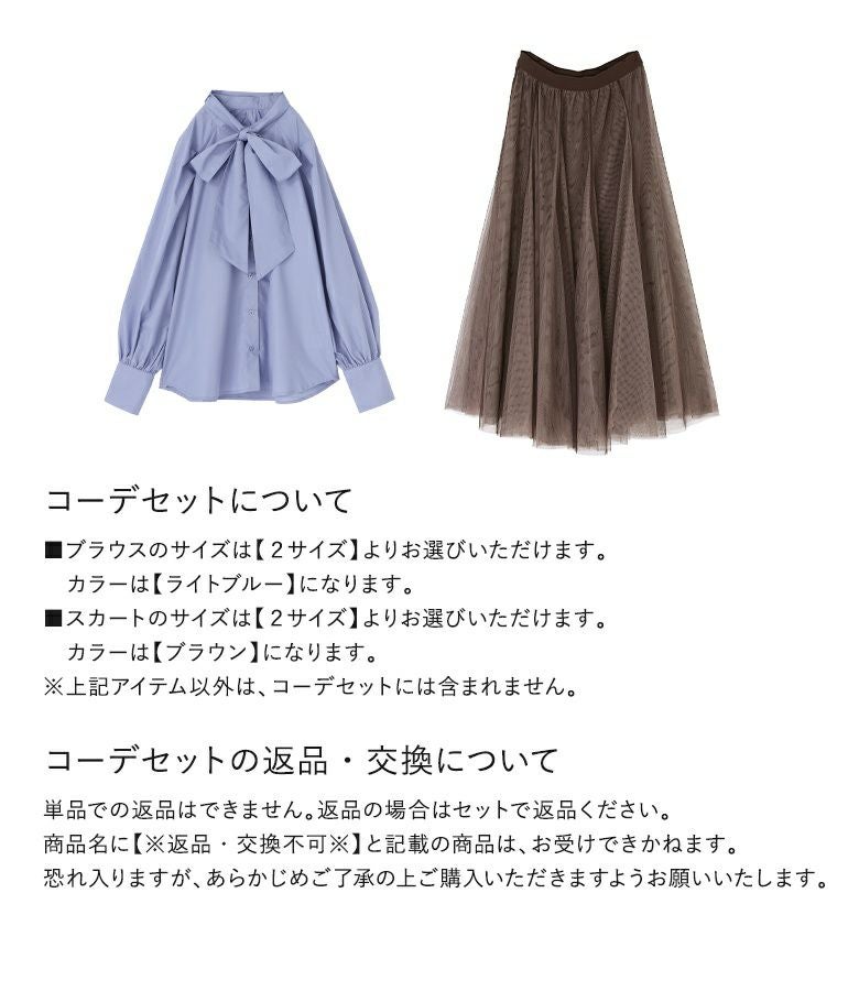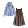 『配色ボリュームチュールスカート×リボンタイ付きラグランブラウスコーデ2点SET』