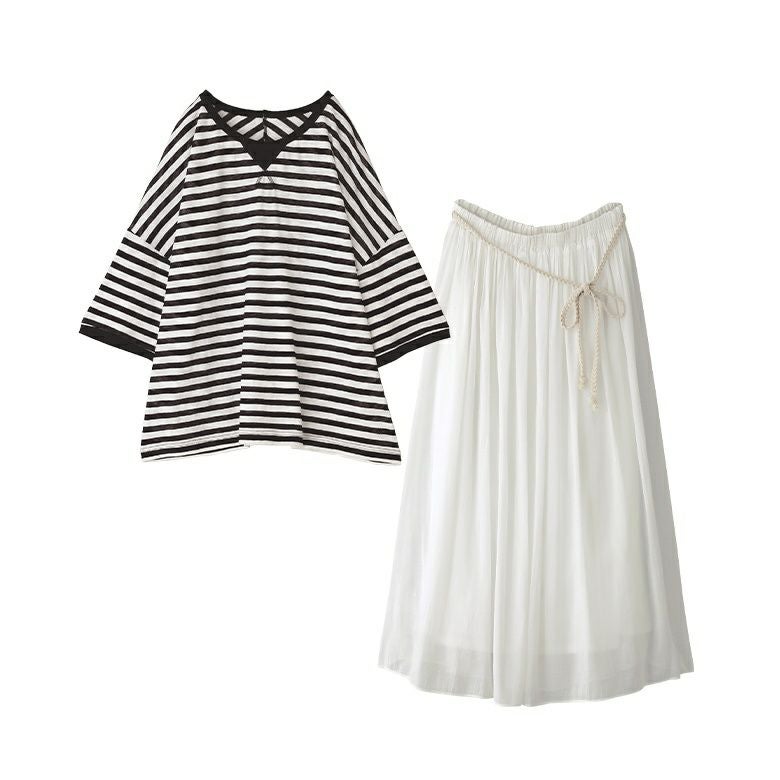 『シアーボーダートップス×ふわさらロングスカートコーデ2点SET』