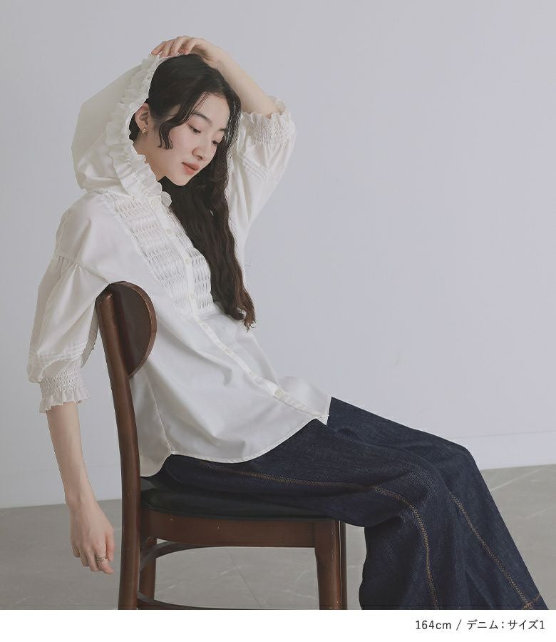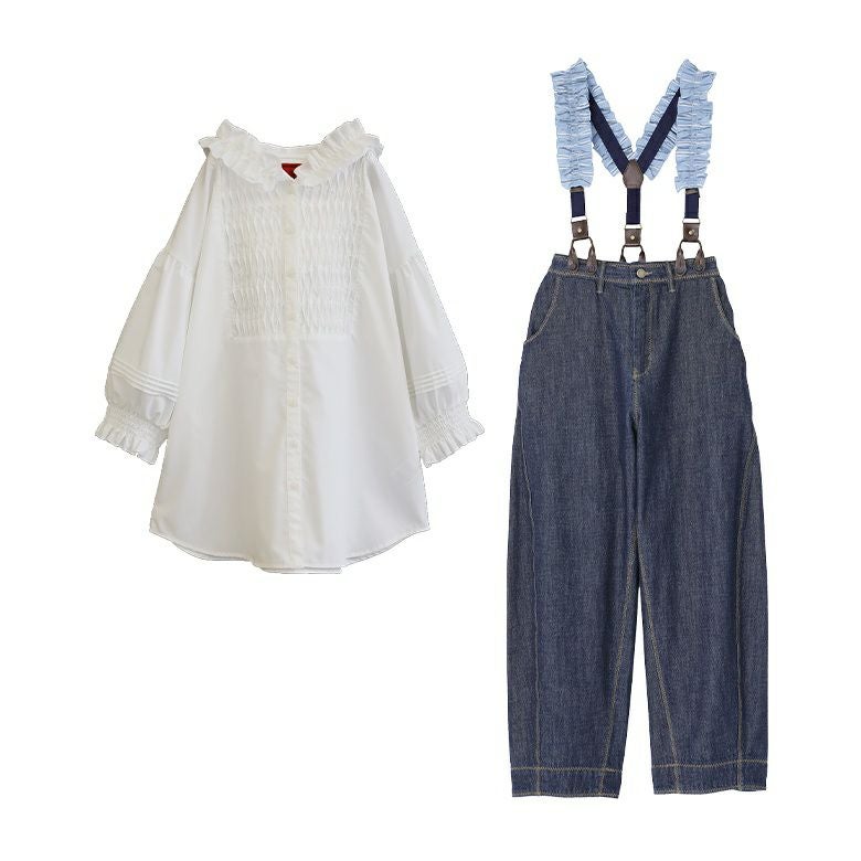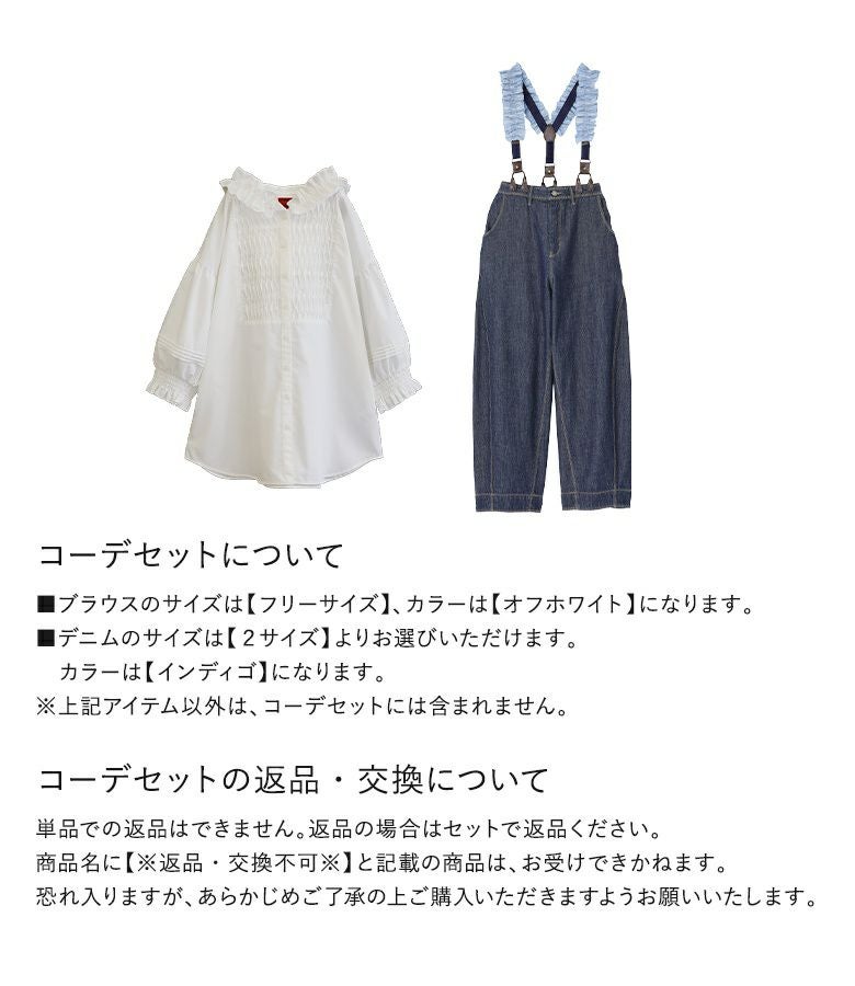 『フリルフードピンタックブラウス×フリルサスペンダー付きデニムコーデ2点SET』