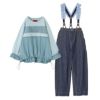 『レースデザインドロストカットソー×フリルサスペンダー付きデニムコーデ2点SET』