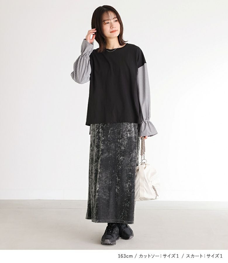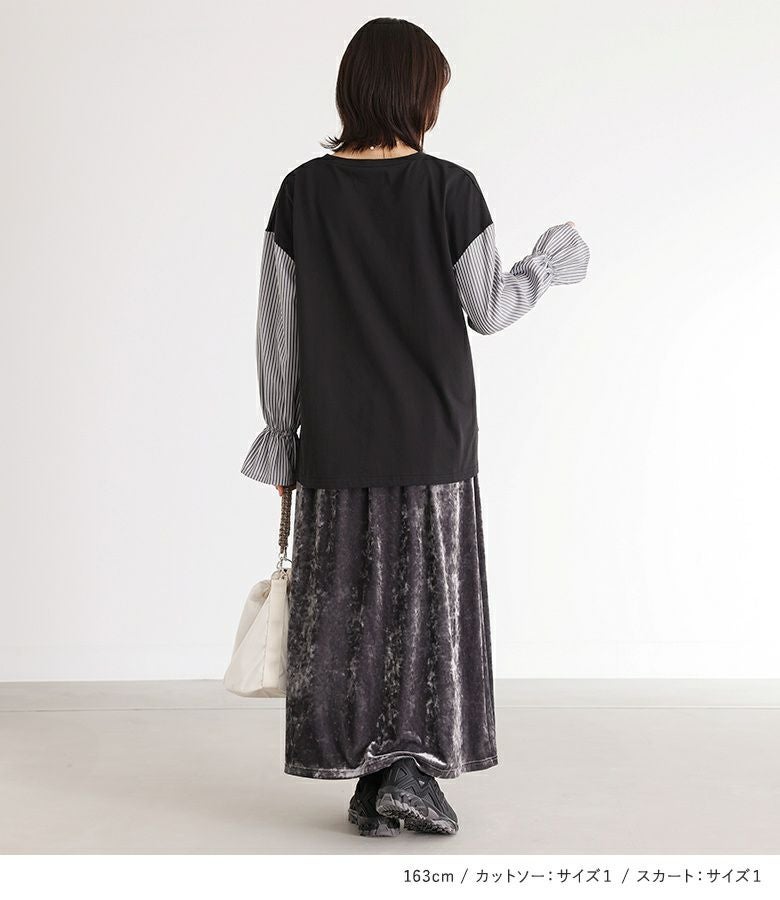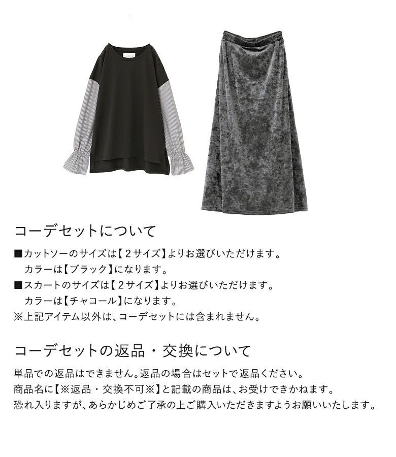 『異素材キャンディースリーブカットソー×クラッシュベロアセミフレアスカートコーデ2点SET』